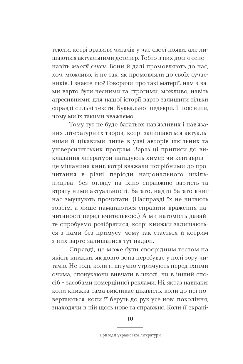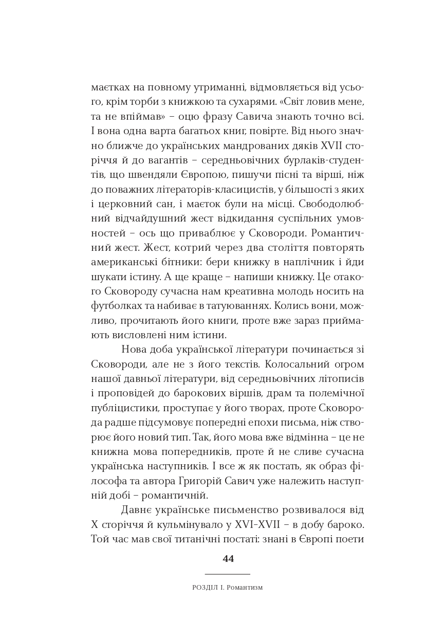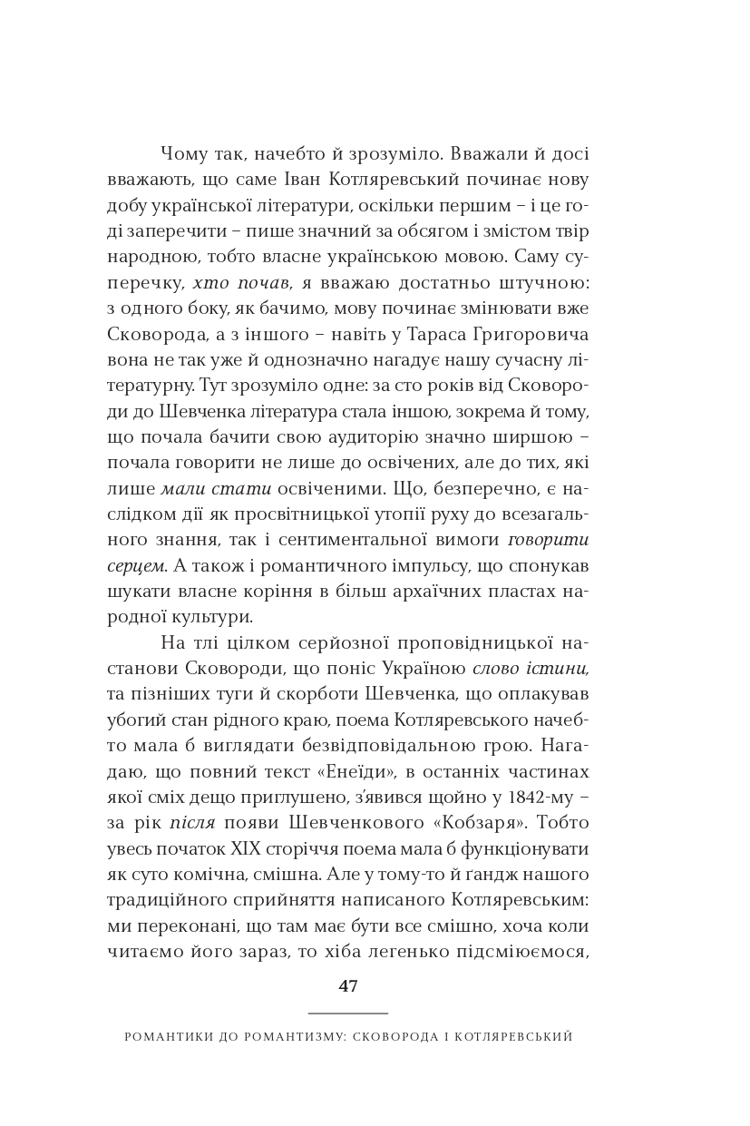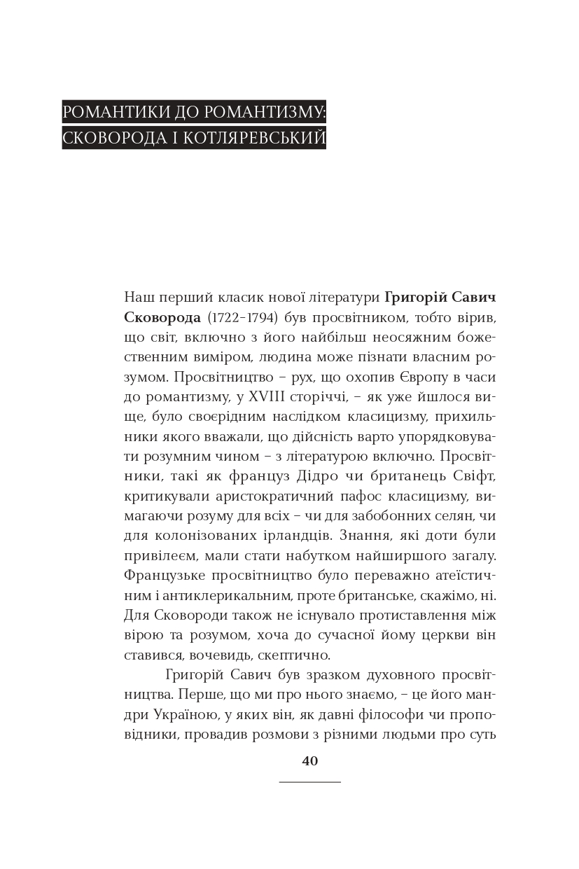 Класицизм, романтизм, реалізм, модернізм, постмодернізм — у школі нас вчили, що культура розвивалася саме так. Ростислав Семків переконує: усе не так просто і значно цікавіше. Рухаючись від майже романтика Сковороди до часом постмодерніста Жадана, він пропонує інколи поглянути на стилі та напрями української літератури під незвичним кутом. А найголовніше — побачити самобутню красу і силу в текстах чільних авторів і авторок нашої літератури.