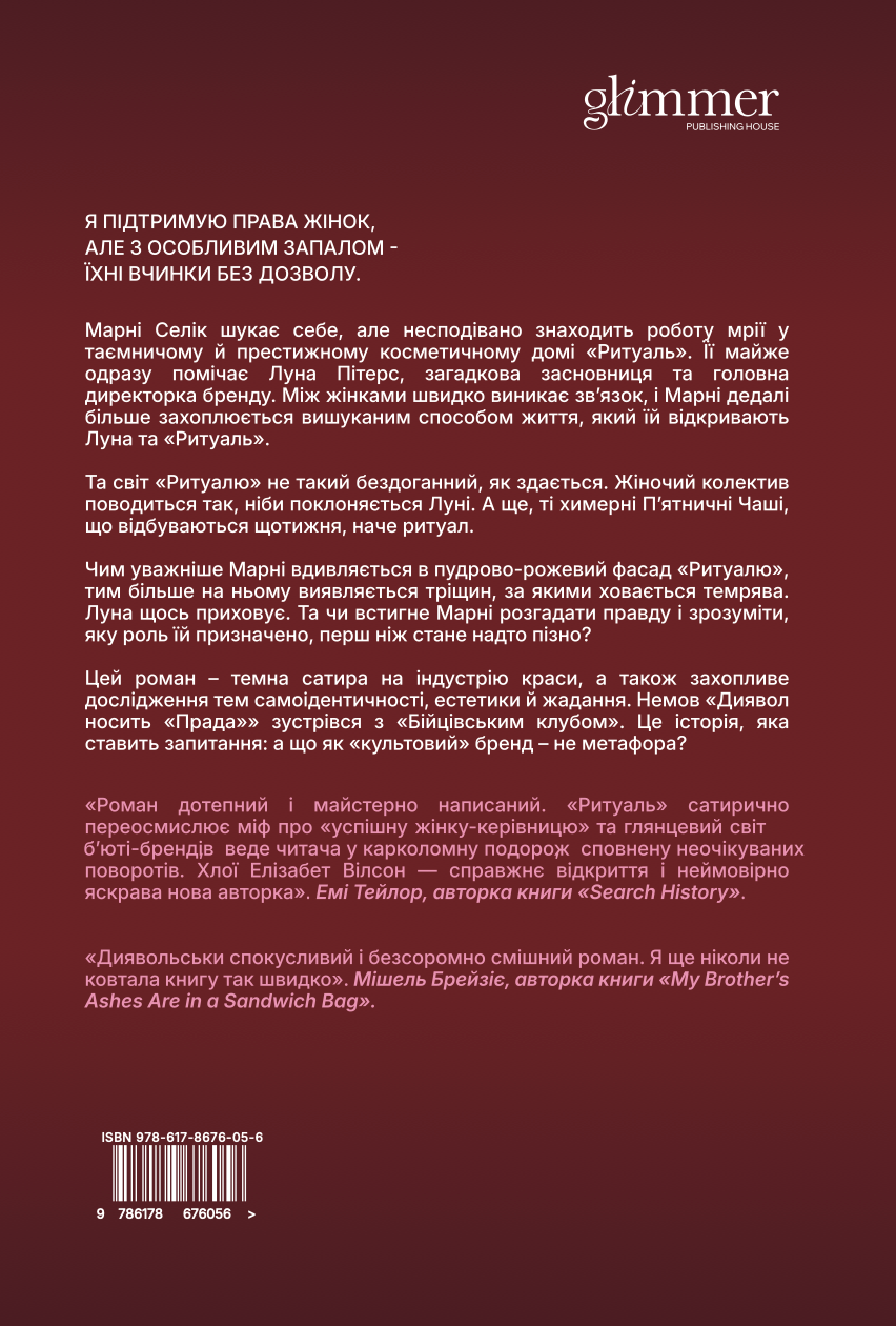 Марні Селік отримує роботу мрії у таємничому косметичному домі «Ритуаль» і потрапляє під чарівність його засновниці Луни Пітерс. Та розкішний світ бренду швидко тріскається: дивні ритуали, поклоніння керівниці й темрява за блиском краси. Темна сатира про індустрію краси, владу та самоідентичність — «Диявол носить Prada» зустрічає «Бійцівський клуб».