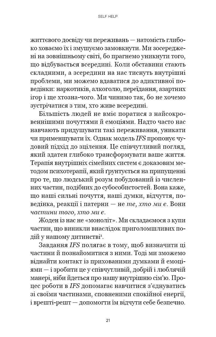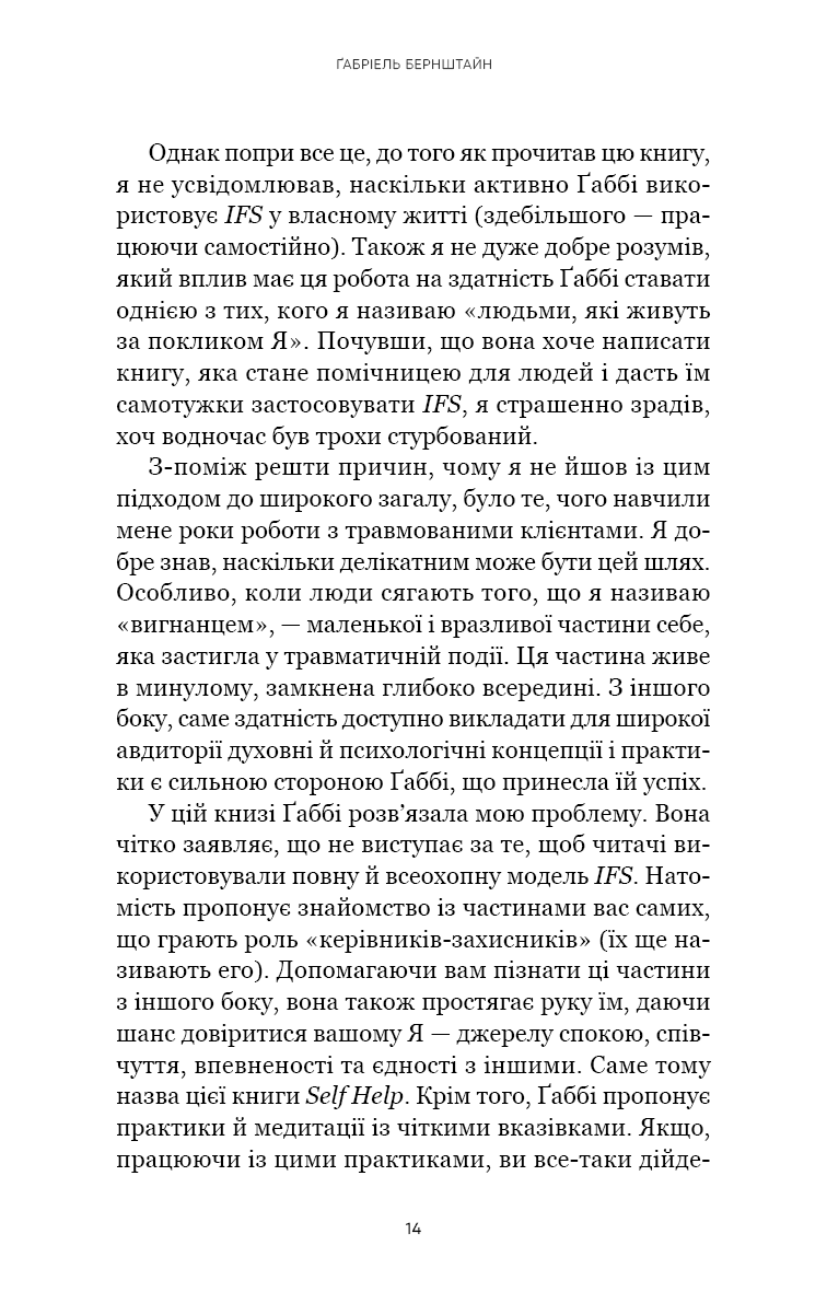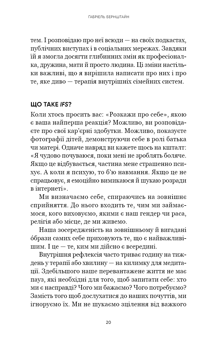 Ґабріель Бернштайн у своїй новій книзі описує шлях до зцілення, який може буквально змінити наше життя, — простий, потужний метод, заснований на терапії внутрішніх сімейних систем (IFS). Вона демістифікує силу терапії IFS, виносячи її з кабінету терапевта у повсякденне життя, і навчає її застосуванню, пропонуючи революційну практику, яка дозволяє радикально змінити наші основні переконання й підключити до безпомилкової внутрішньої системи управління. Ділячись своєю мудрістю і власним життєвим досвідом, Ґабріель Бернштайн проведе читачів через простий чотириетапний процес, який допоможе їм навчитися піклуватися про себе, розв’язувати внутрішні конфлікти і змінити самосприйняття.