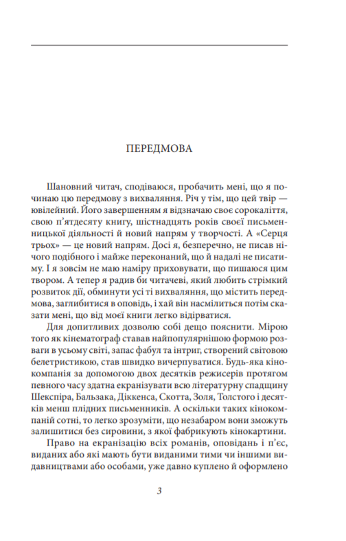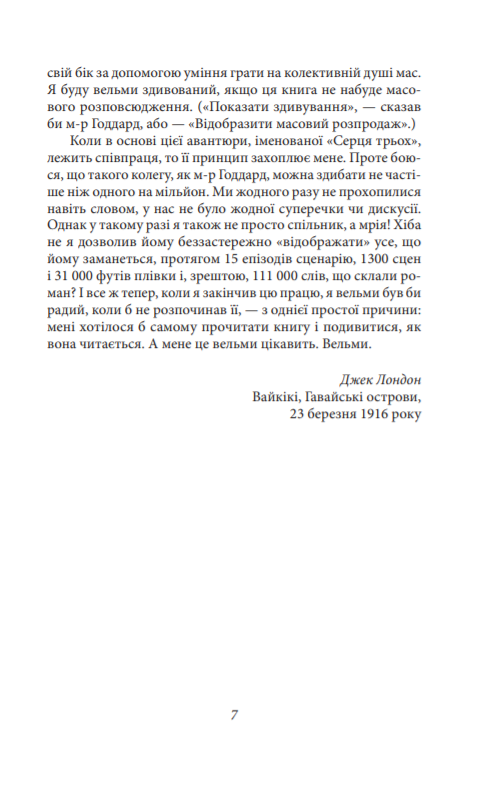 «Серця трьох» — взірець пригодницького роману й перлина творчого доробку американського класика Джека Лондона (1876–1916), життя якого саме нагадувало велику пригоду. В передмові автор пояснює, що відсутність цікавих і гострих сюжетів для кінематографу й спонукала написати цей твір. Тож роман «зроблено» в найкращих традиціях голлівудського кіно (він і був написаний на основі кіносценарію): спекотна Південна Америка, любовний трикутник, пристрасть, пригоди, помста, зради, гонитва за багатствами й суперництво — чесне й не дуже.