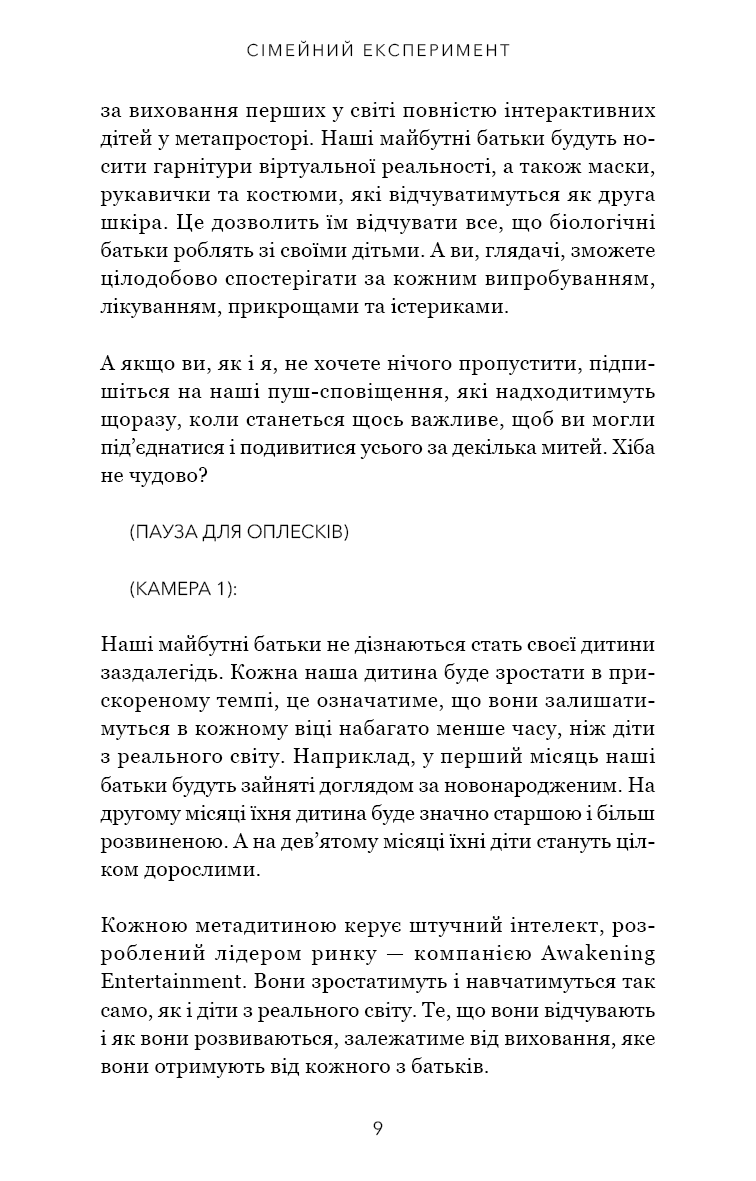 Але тим, хто мріє про батьківство, доступна альтернатива. За щомісячну абонентську плату клієнти можуть створити віртуальну дитину, до якої вони матимуть доступ у метавсесвіті за допомогою VR-гарнітури і тактильного костюма. Щоб запустити цей проєкт, компанія-розробник віртуальних дітей створила реаліті-шоу «Сімейний експеримент». У ньому братимуть участь ретельно відібрані пари, які виховуватимуть віртуальну дитину від народження до вісімнадцяти років, але в стислі терміни — дев’ять місяців. Головний приз: право залишити метадитину або позбутися її заради можливості мати справжнього малюка...