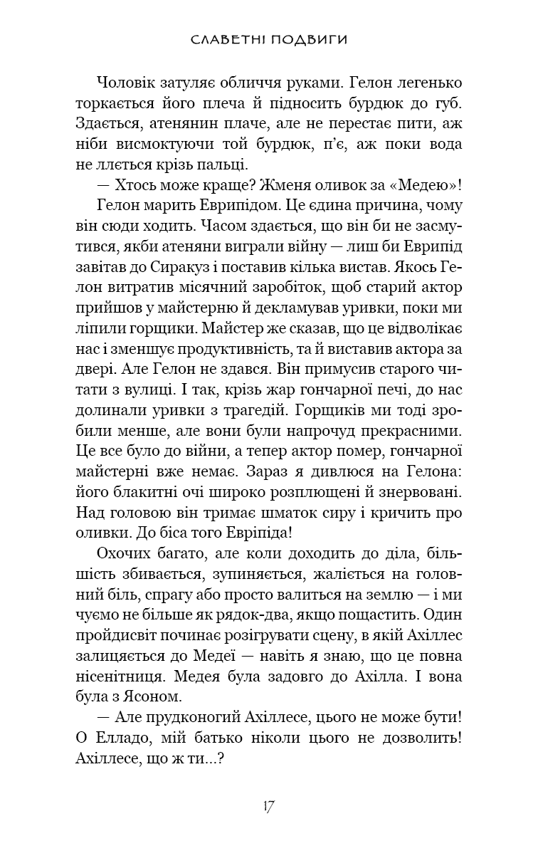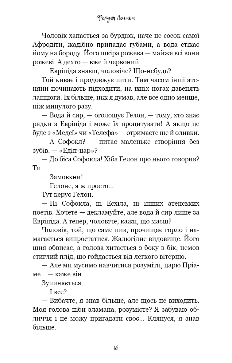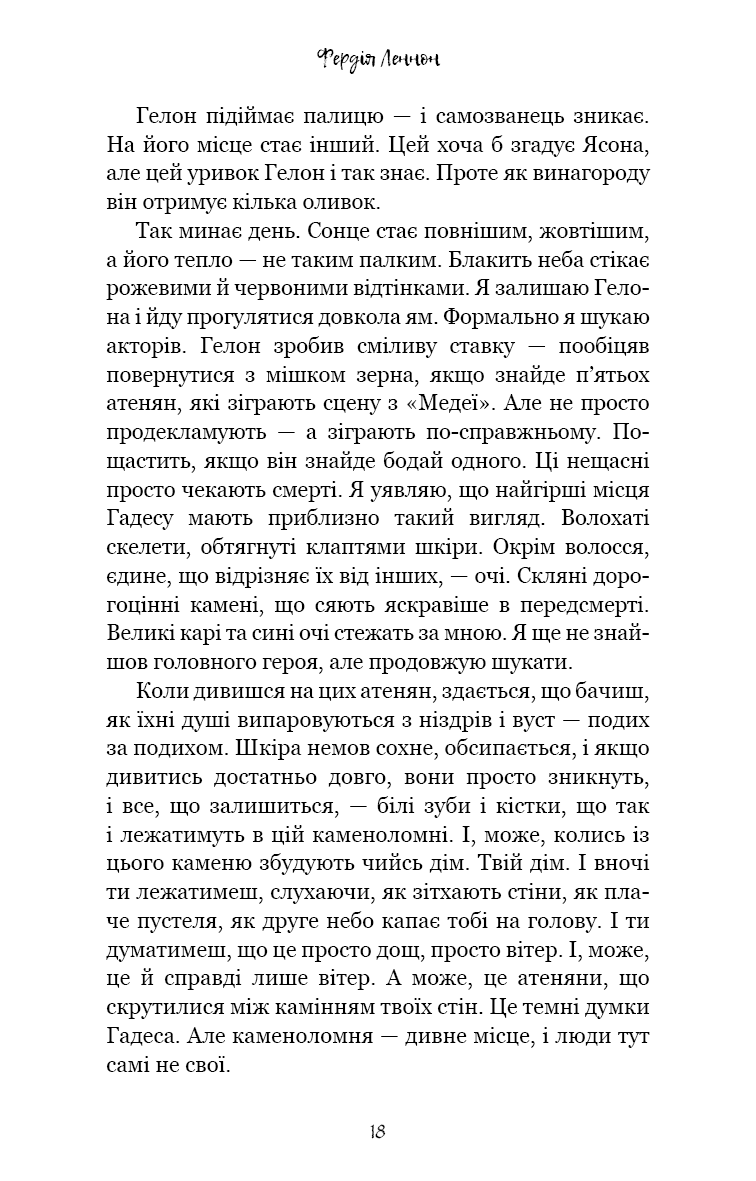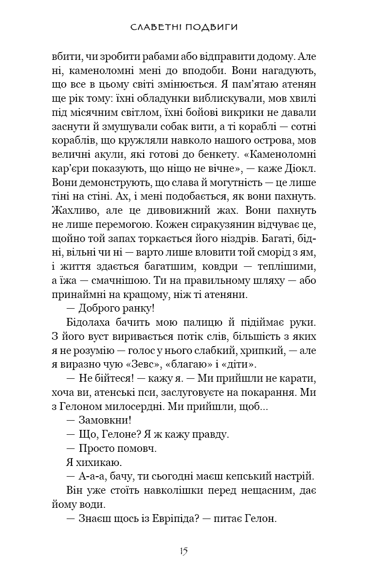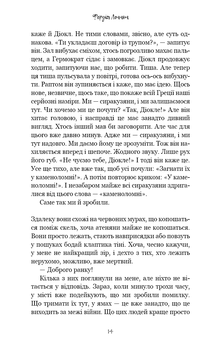 Ув’язнені в сиракузьких каменоломнях тисячі переможених атенян тримаються на волосині від смерті. Вони повільно згасають під палючим сонцем, проте полонені досі можуть читати грецькі трагедії, якщо підманити їх ковтком вина та шматком хліба. Так народжується ідея. Адже загарбників можна ненавидіти — але при цьому щиро любити їхню поезію.