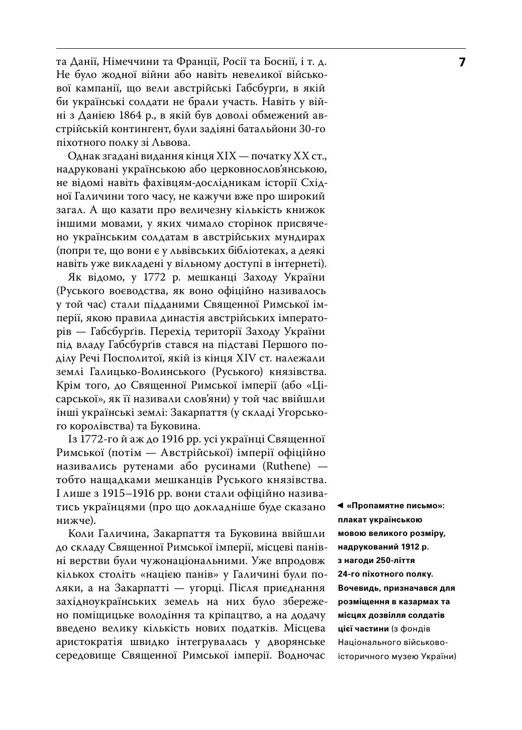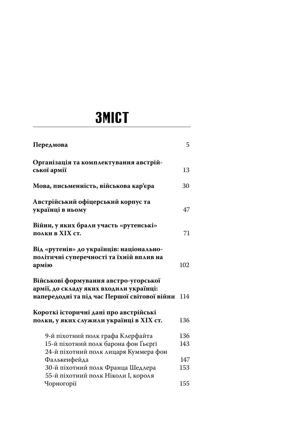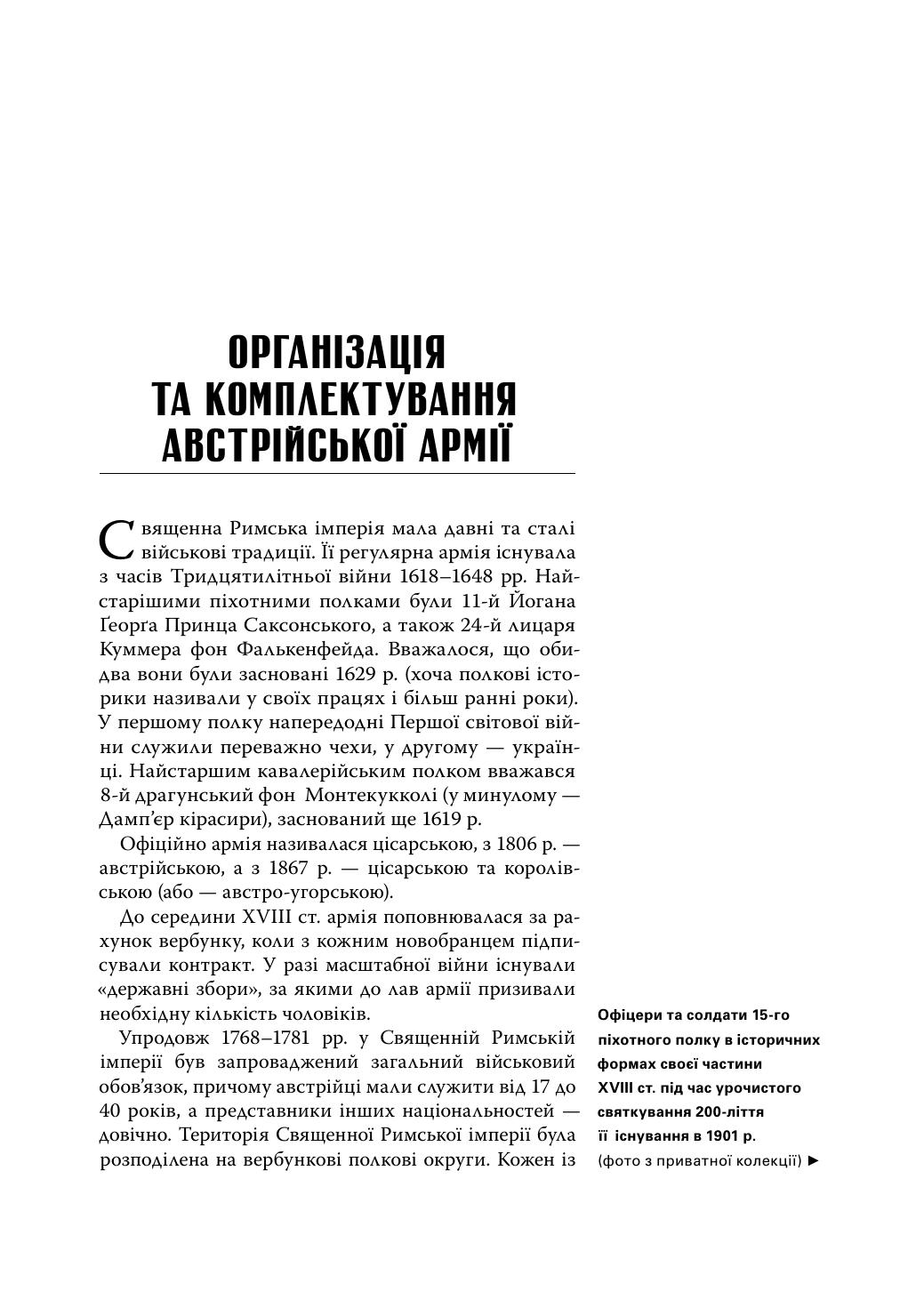 У книжці йдеться про військову службу українців в імперії Габсбурґів: вік та час призову, можливості для кар’єри в офіцерському корпусі й серед підофіцерів, мовне питання в багатонаціональній армії, участь у багатьох війнах на Європейському континенті в ХІХ — на початку ХХ століття. Крім того, подано короткі історичні хроніки піхотних та кавалерійських полків, у яких служили українці. Книжка містить багато ілюстрацій, чимало з них опубліковано вперше.