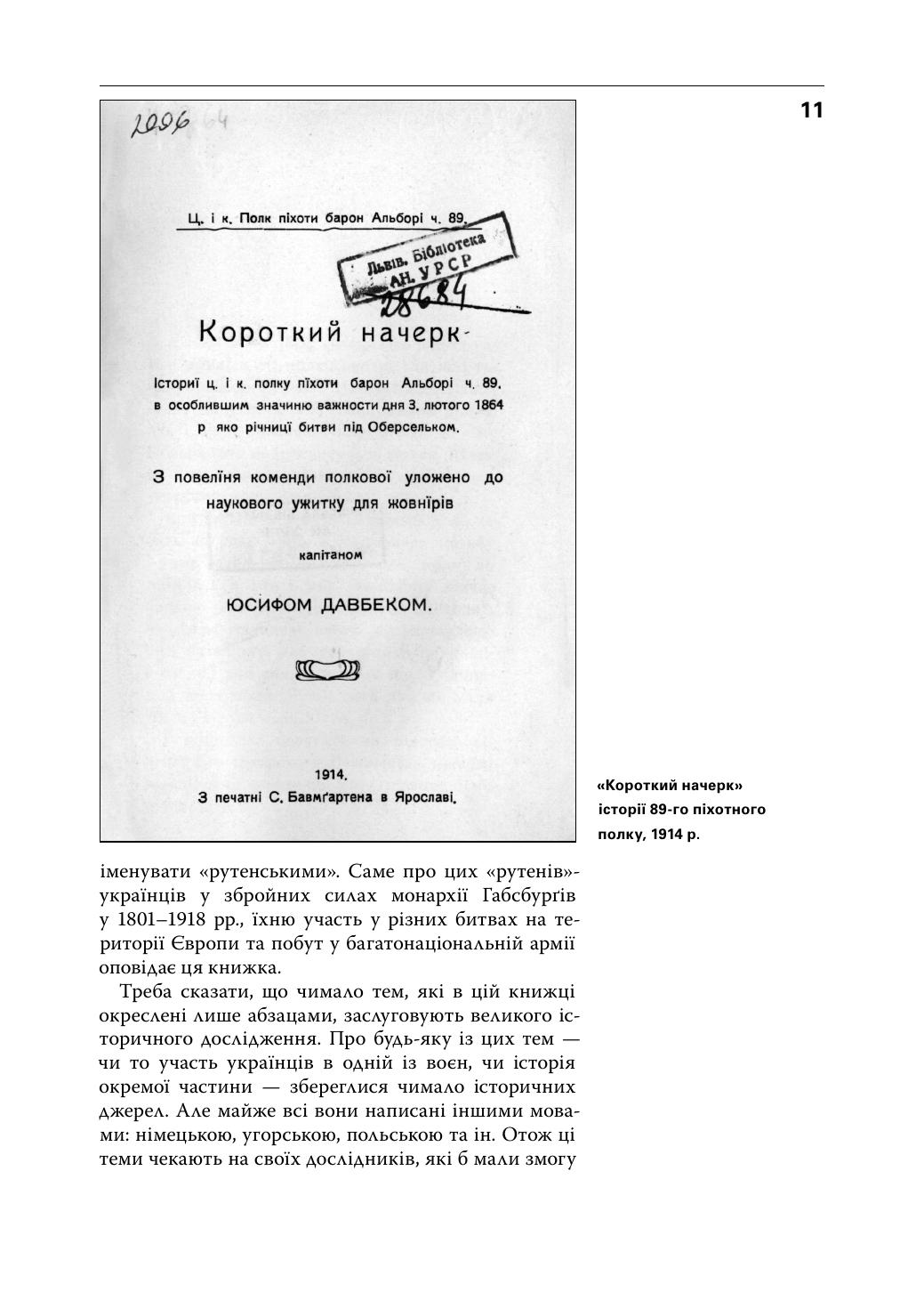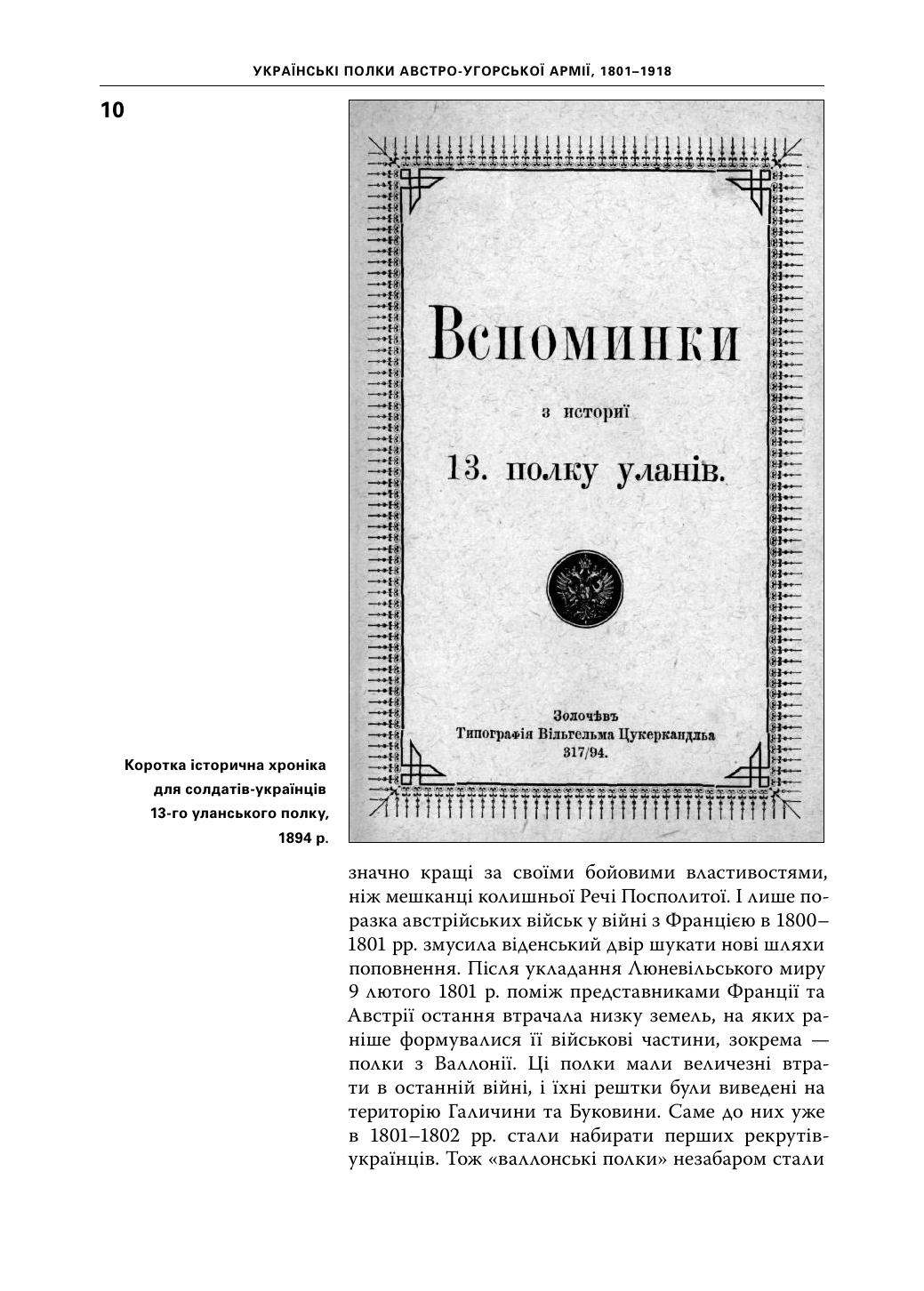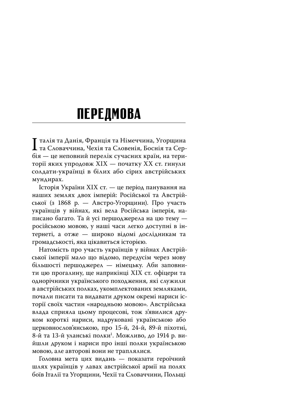 У книжці йдеться про військову службу українців в імперії Габсбурґів: вік та час призову, можливості для кар’єри в офіцерському корпусі й серед підофіцерів, мовне питання в багатонаціональній армії, участь у багатьох війнах на Європейському континенті в ХІХ — на початку ХХ століття. Крім того, подано короткі історичні хроніки піхотних та кавалерійських полків, у яких служили українці. Книжка містить багато ілюстрацій, чимало з них опубліковано вперше.