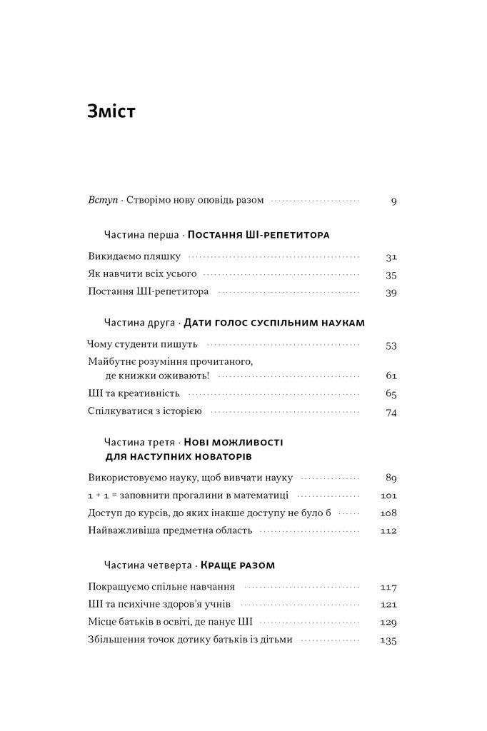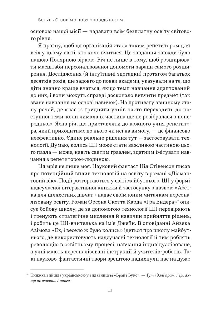 Штучний інтелект вже стукає у двері шкіл та університетів. Перед нами вибір: чинити супротив і бачити в ньому загрозу звичним підходам до освіти, або ж зробити ШІ потужним союзником, що відкриє безмежні можливості для навчання. У цій книжці Салман Хан — засновник всесвітньо відомої Khan Academy — стверджує, що ми стоїмо на порозі безпрецедентної освітньої революції, показує дієві підходи до освіти та самоосвіти із застосуванням ШІ.