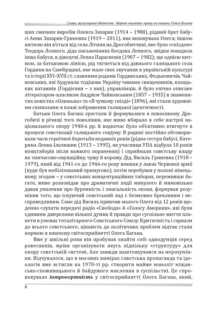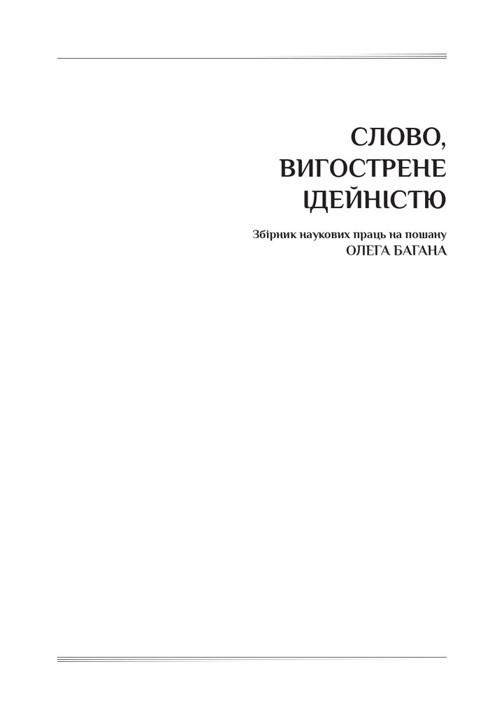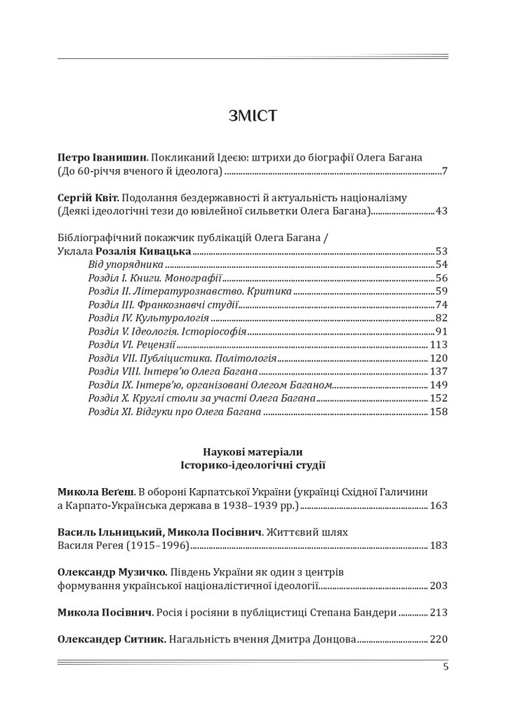 Збірник наукових праць присвячений 60-річчю відомого в Україні літературознавця, есеїста-культуролога, ідеолога й теоретика сучасного українського націоналізму, публіциста Олега Багана. Видання містить студії українських істориків та теоретиків політичної думки, літературознавців, які співпрацювали в різних ділянках національною культури й науки з ювіляром, утверджуюючи ідейні принципи української національної гідності та інтелектуальної суверенності, які він пропагував своєю творчістю. Збірник доповнений бібліографічним покажчиком публікацій О. Багана, який дозволяє збагнути повноту доробку вченого й публіциста.