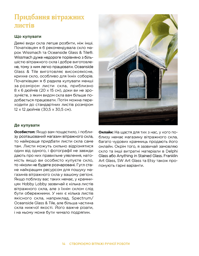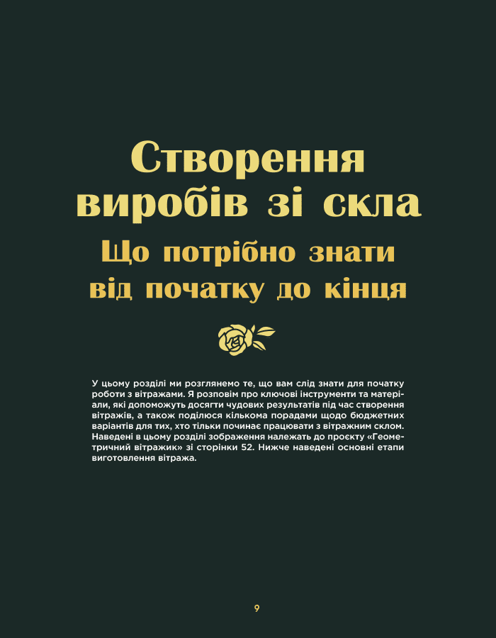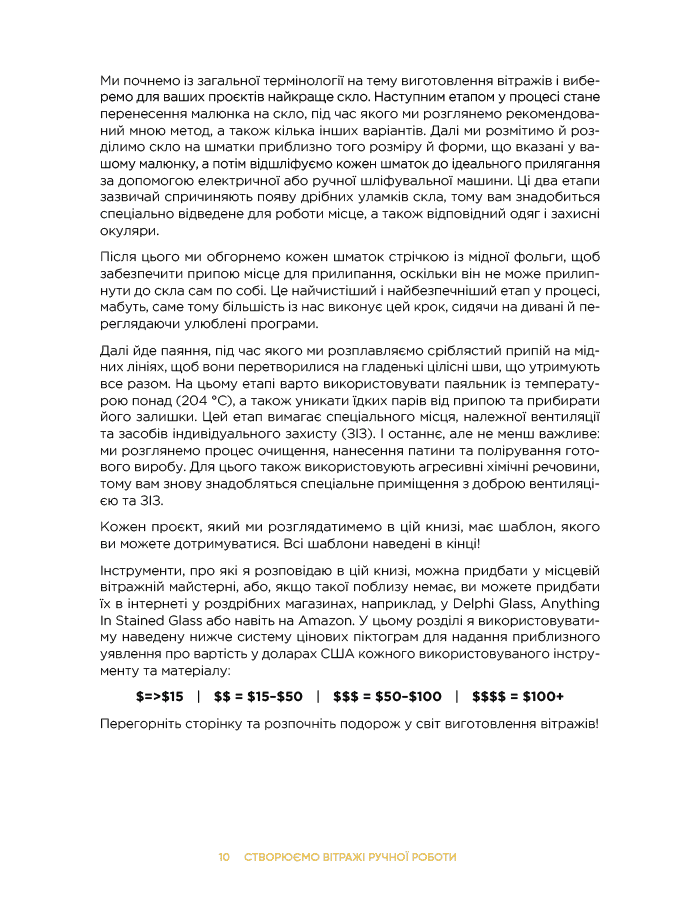 Пориньте у захопливий світ вітражів із цим практичним посібником «Створюємо вітражі ручної роботи» для початківців і не тільки. Розі Лайнбо — досвідчена майстриня, яка легко й доступно розповідає про виготовлення сучасних вітражів. Завдяки її підбадьорливим порадам, поетапним інструкціям, безсвинцевому підходу та повнорозмірним розкладним шаблонам ви ніколи не захочете полишати вітражну майстерню.Почніть з опанування базових навичок, зокрема, з вирізування кривих для осяйної «П’ятипелюсткової польової квітки» або з використання цинкового профілю для блискучого «Скляного павутиння». Потім вивчіть, як нові матеріали та навички можуть покращити ваші вироби, наприклад, використайте мідну фольгу для створення витончених крил у вітражі «Дзижчання джмеля». Нарешті, перейдіть до виготовлення складних детальних панно, наприклад, променистого «Фантастичного пейзажу із Сонцем та Місяцем» з дротяними деталями.Розі не тільки проведе вас через кожен етап подорожі, а й зверне увагу на найпоширеніші питання та проблеми, що виникають у більшості майстрів-початківців на цьому шляху. А оскільки в кожному проєкті Розі навчає новій техніці, під кінець книги ви матимете все потрібне для створення власних вишуканих і неповторних робіт!