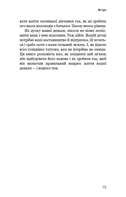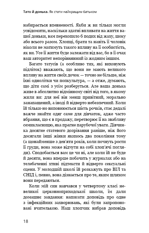 Спираючись на свій 30-річний досвід роботи в педіатричній і підлітковій медицині, експертка зі здоров’я підлітків докторка Меґ Мікер пояснює, чому активна фігура батька є одним із найважливіших факторів у становленні молодої жінки. У цій книзі авторка показує, як батько може бути порадником, опорою і захисником для своєї доньки, формувати її внутрішню силу, впевненість у собі та цілеспрямованість і водночас плекати ніжність, м’якість, довіру до світу й життя.