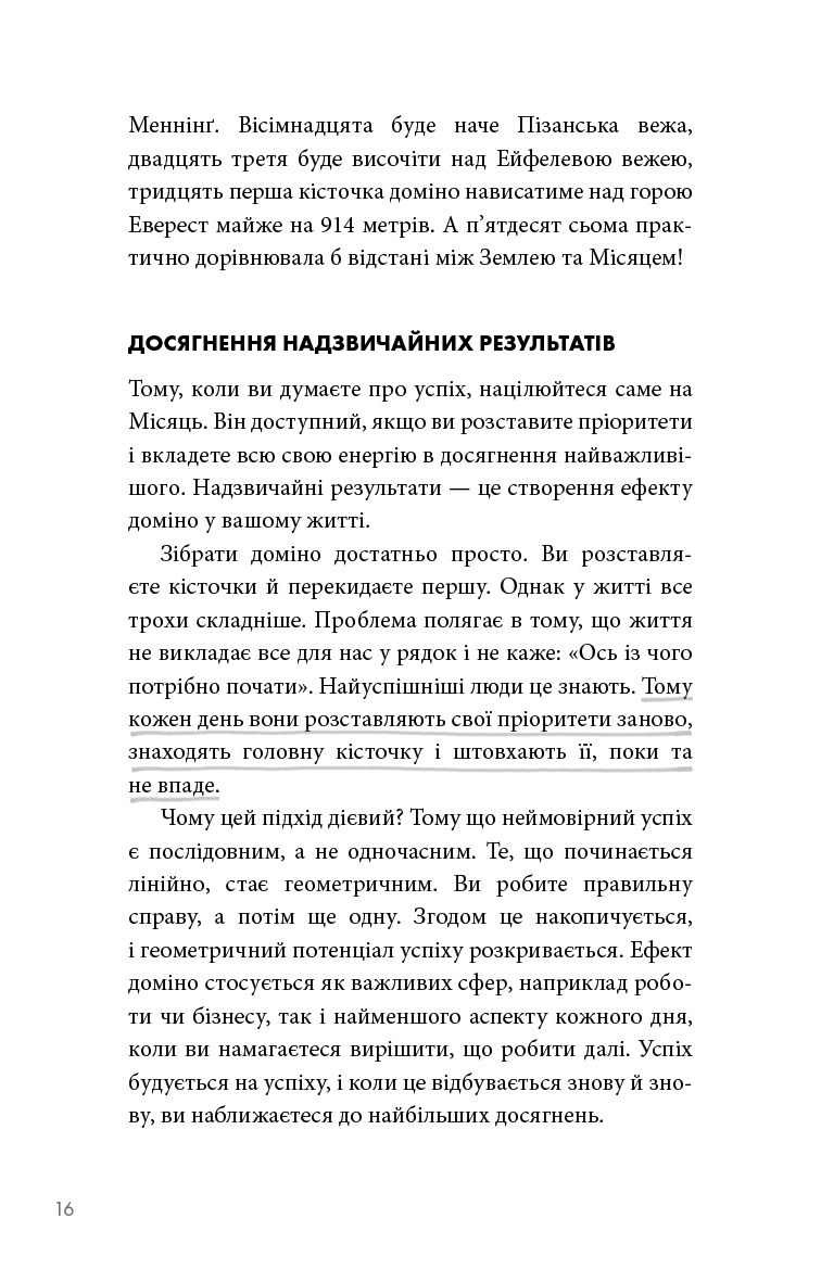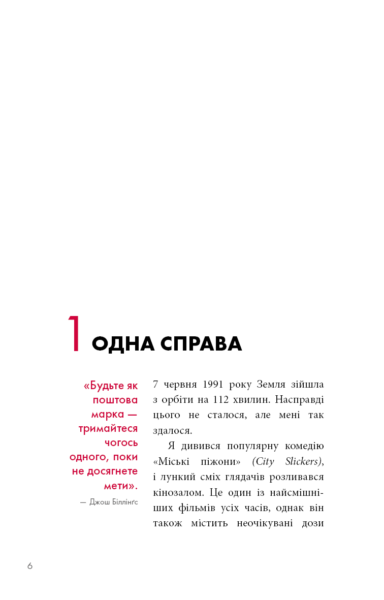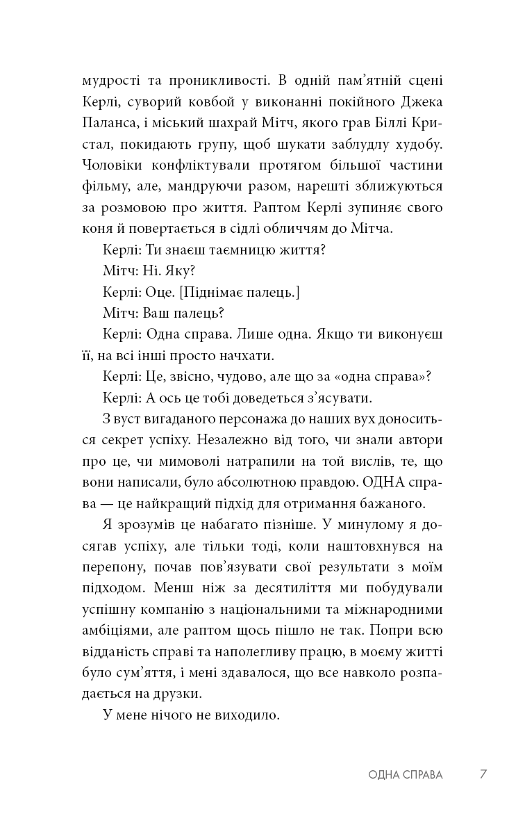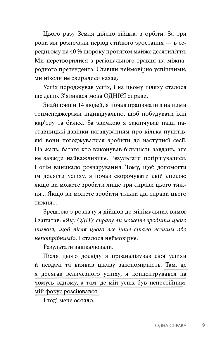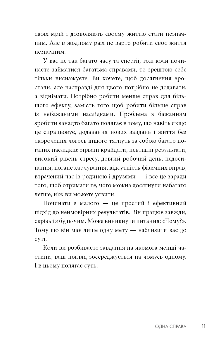 Люди використовують просту, але потужну концепцію The ONE Thing, щоб зосередитися на тому, що найважливіше в їхньому особистому та робочому житті. Спрямовуючи свою енергію в одну справу за раз, люди живуть більш повноцінним життям, будують кар'єру, зміцнюють фінансовий стан, покращують фізичну форму, плекають міцніший шлюб та особисті стосунки. Книга Ґері Келлера допомогла понад 3 мільйонам читачів прорватися крізь безлад неорганізованого життя, досягти кращих результатів за коротший час, зменшити стрес, відновити свою енергію. Вона перекладена на понад 40 мов, відзначена 12 книжковими преміями й перебуває у списку найкращих бізнес-книг усіх часів за версією Goodreads.