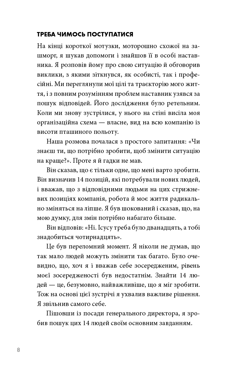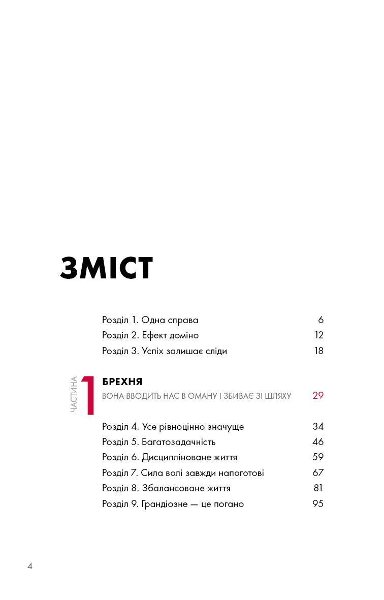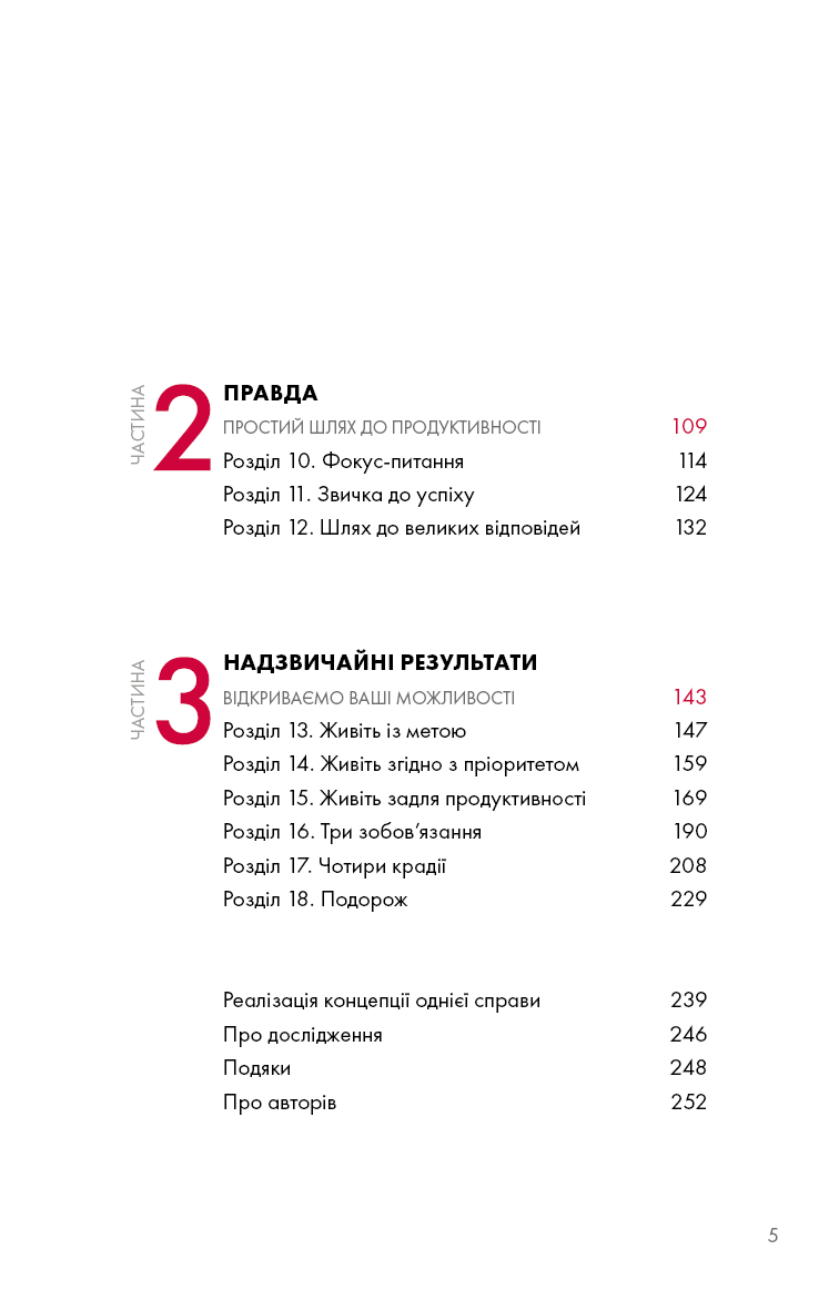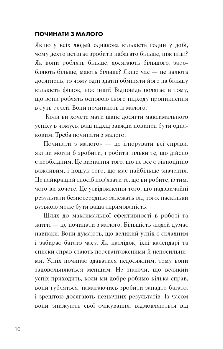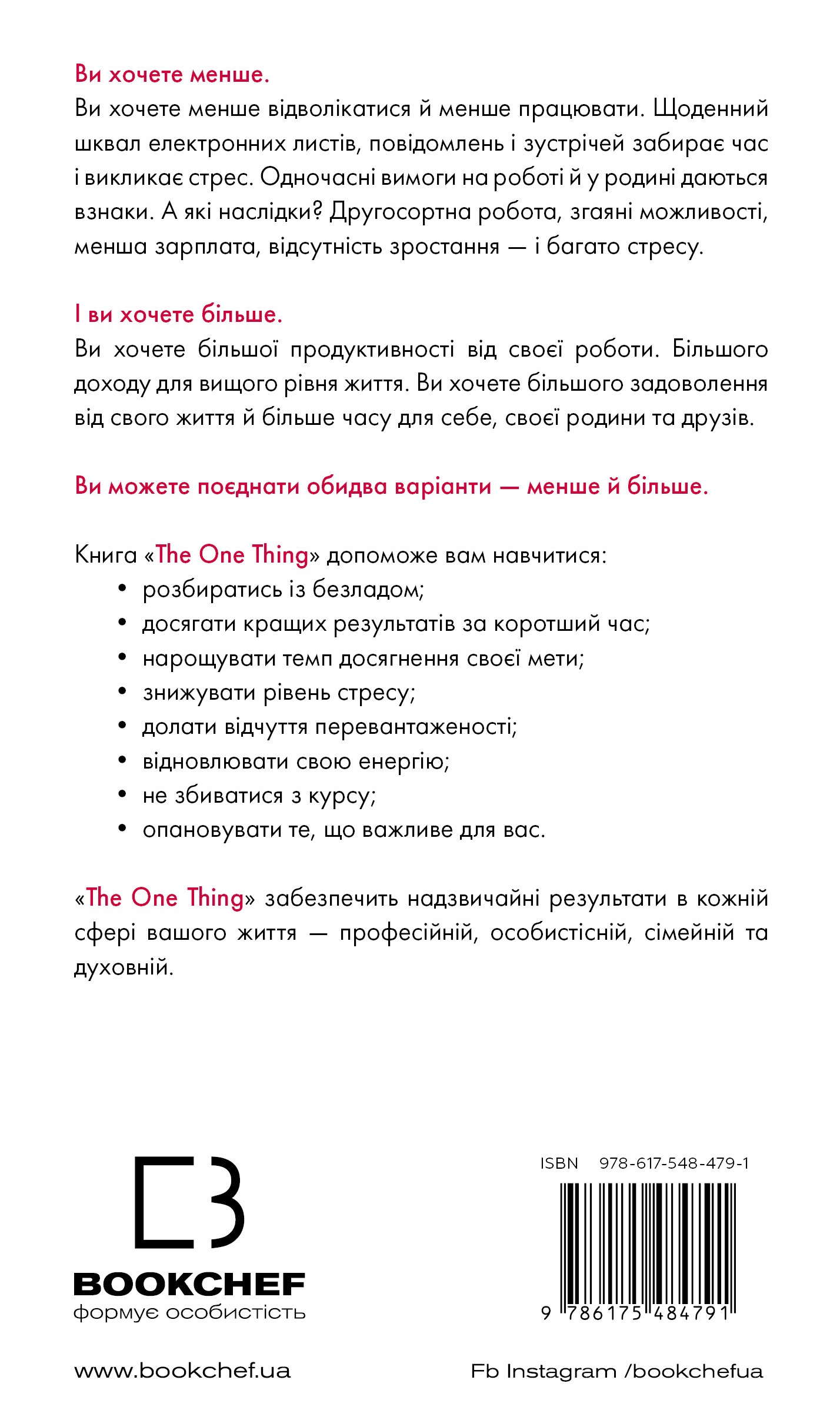 Люди використовують просту, але потужну концепцію The ONE Thing, щоб зосередитися на тому, що найважливіше в їхньому особистому та робочому житті. Спрямовуючи свою енергію в одну справу за раз, люди живуть більш повноцінним життям, будують кар'єру, зміцнюють фінансовий стан, покращують фізичну форму, плекають міцніший шлюб та особисті стосунки. Книга Ґері Келлера допомогла понад 3 мільйонам читачів прорватися крізь безлад неорганізованого життя, досягти кращих результатів за коротший час, зменшити стрес, відновити свою енергію. Вона перекладена на понад 40 мов, відзначена 12 книжковими преміями й перебуває у списку найкращих бізнес-книг усіх часів за версією Goodreads.