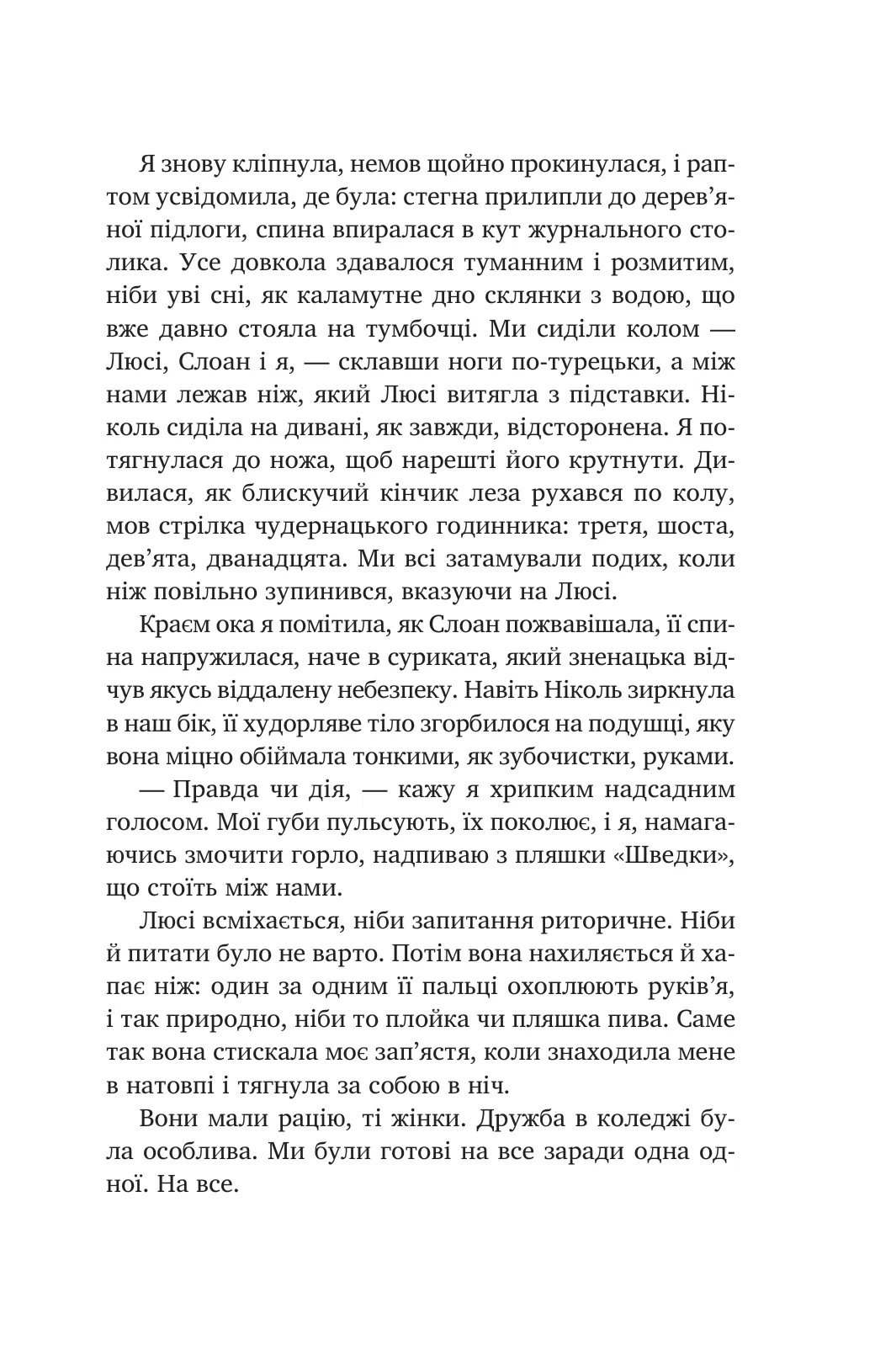 І ось Марґо опиняється в будинку поза кампусом з трьома іншими дівчатами: лідеркою Люсі, саркастичною Слоан і милою Ніколь. Вони різні, але водночас тісно пов'язані. Цей рік стане для Марґо переломним: вона нарешті вийде зі шкаралупи, у якій жила після смерті найкращої подруги Елізи. До середини другого курсу Марґо й Люсі стануть нерозлучними подругами — аж поки одного дня хлопця із сусіднього братства не знайдуть жорстоко вбитим... а Люсі Шарп не зникне без сліду.