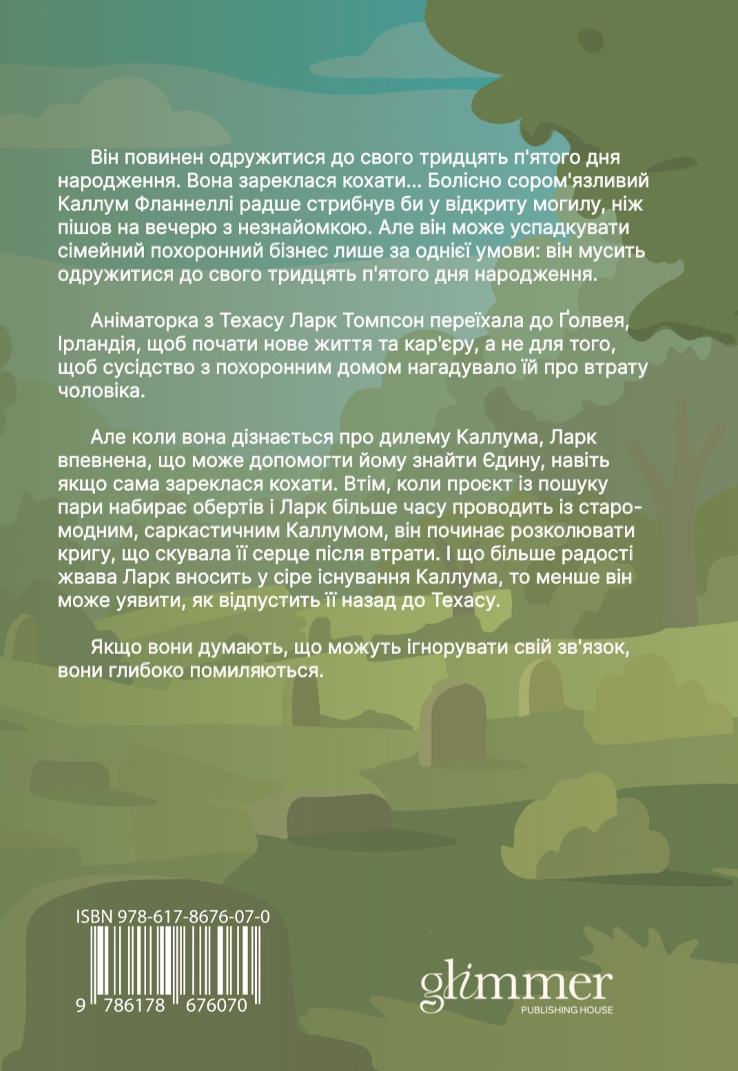 Він повинен одружитися до свого тридцять п'ятого дня народження. Вона зареклася кохати... Болісно сором'язливий Каллум Фланнеллі радше стрибнув би у відкриту могилу, ніж пішов на вечерю з незнайомкою. Але він може успадкувати сімейний похоронний бізнес лише за однієї умови: він мусить одружитися до свого тридцять п'ятого дня народження. Аніматорка з Техасу Ларк Томпсон переїхала до Ґолвея, Ірландія, щоб почати нове життя та кар'єру, а не для того, щоб сусідство з похоронним домом нагадувало їй про втрату чоловіка. Але коли вона дізнається про дилему Каллума, Ларк впевнена, що може допомогти йому знайти Єдину, навіть якщо сама зареклася кохати. Утім, коли проєкт із пошуку пари набирає обертів і Ларк більше часу проводить зі старомодним, саркастичним Каллумом, він починає розколювати кригу, що скувала її серце після втрати. І що більше радості жвава Ларк вносить у сіре існування Каллума, то менше він може уявити, як відпустить її назад до Техасу. Якщо вони думають, що можуть ігнорувати свій зв'язок вони глибоко помиляються.