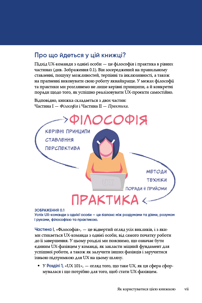 UX-команди в одній особі — це люди, які прагнуть створювати якісний досвід для користувачів, дбаючи про те, щоб бізнес отримував відповіді на свої запитання, проблеми дизайну належно вивчалися й креативно вирішувалися, а продукт постійно відстежувався і вдосконалювався.Часто таким людям доводиться брати на себе комплекс завдань, розрахований на команду фахівців. У книзі «UX-КОМАНДА В ОДНІЙ ОСОБІ: Як вижити в дослідженнях і дизайні» авторів Лії Б’юлі та Джо Натолі розглянуто методи та запропоновано практичні поради, що допоможуть систематизувати роботу й досягати потрібних результатів, а також презентувати й пояснювати їх колегам і клієнтам, підвищуючи їхню обізнаність у царині UX та залучаючи їх як союзників і помічників.Утім, фахівцеві з UX, що працює в розгалуженій корпоративній команді, ця книжка також не раз стане в пригоді. У ній завжди можна швидко знайти інструмент, потрібний у тій чи іншій конкретній ситуації, та за потреби адаптувати його до командної роботи.