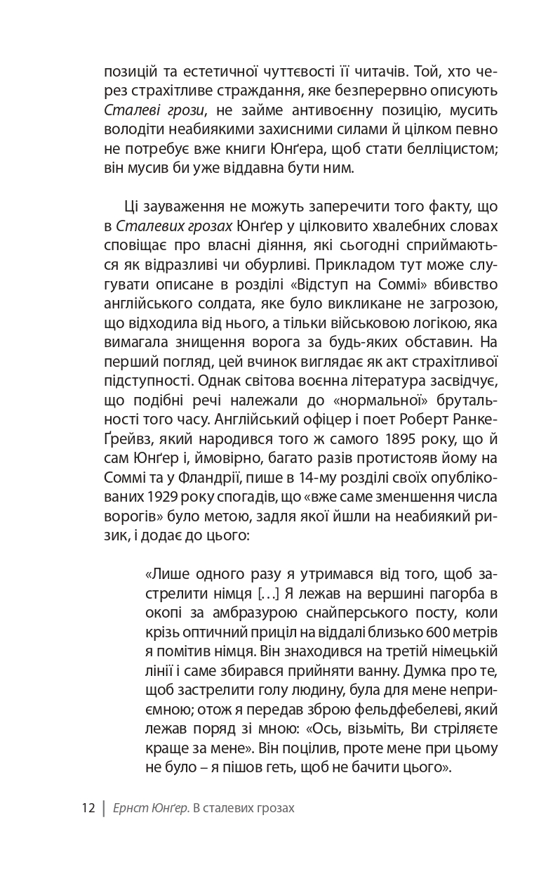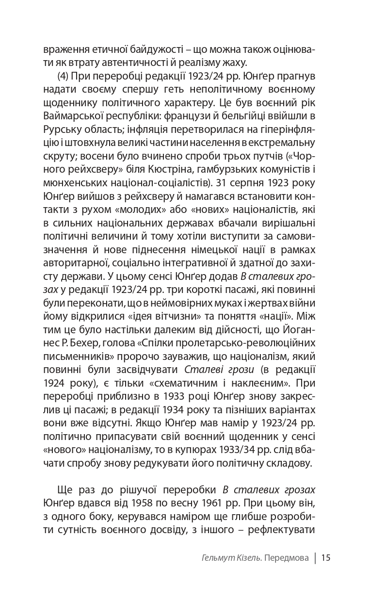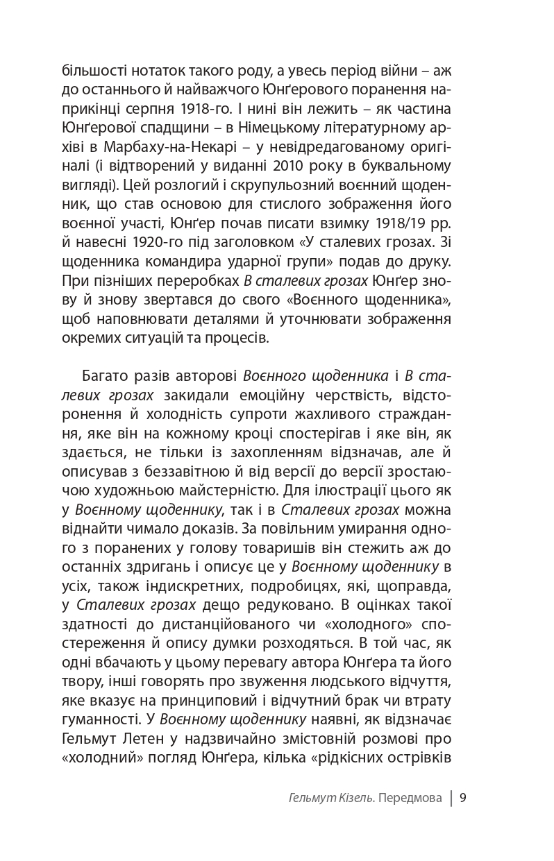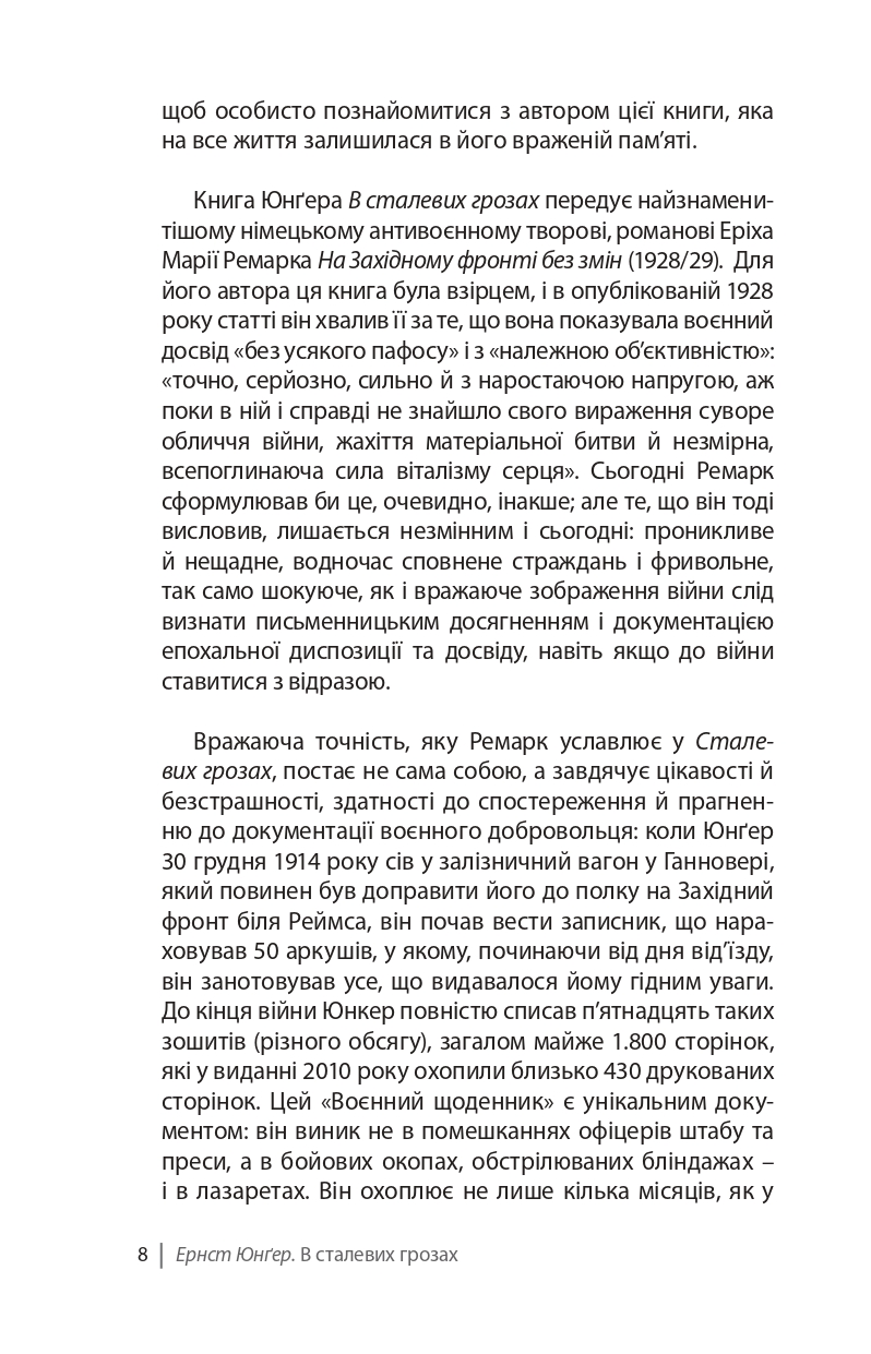 Найвідоміша книга Ернста Юнґера "В сталевих грозах", яка має підзаголовок "Зі щоденника командира ударної групи", була вперше опублікована 1920 р. коштом автора й упродовж кількох років стала бестселером. Це, можливо, найдокладніша, найправдивіша, найважливіша книга про Першу світову війну. Форма щоденника виявилася при цьому адекватним засобом передачі фронтових вражень: регулярні й точні, хоча й фрагментарні нотатки утворюють врешті-решт багатоманітну й вражаючу воєнну мозаїку, яка не могла б бути переконливішою.
