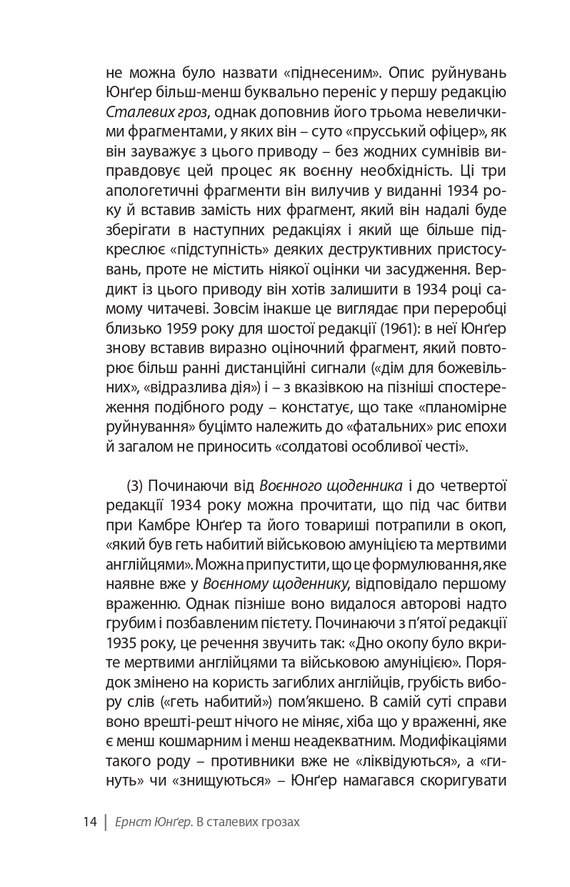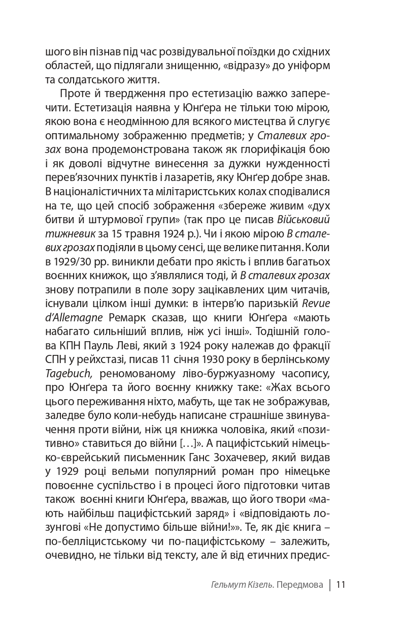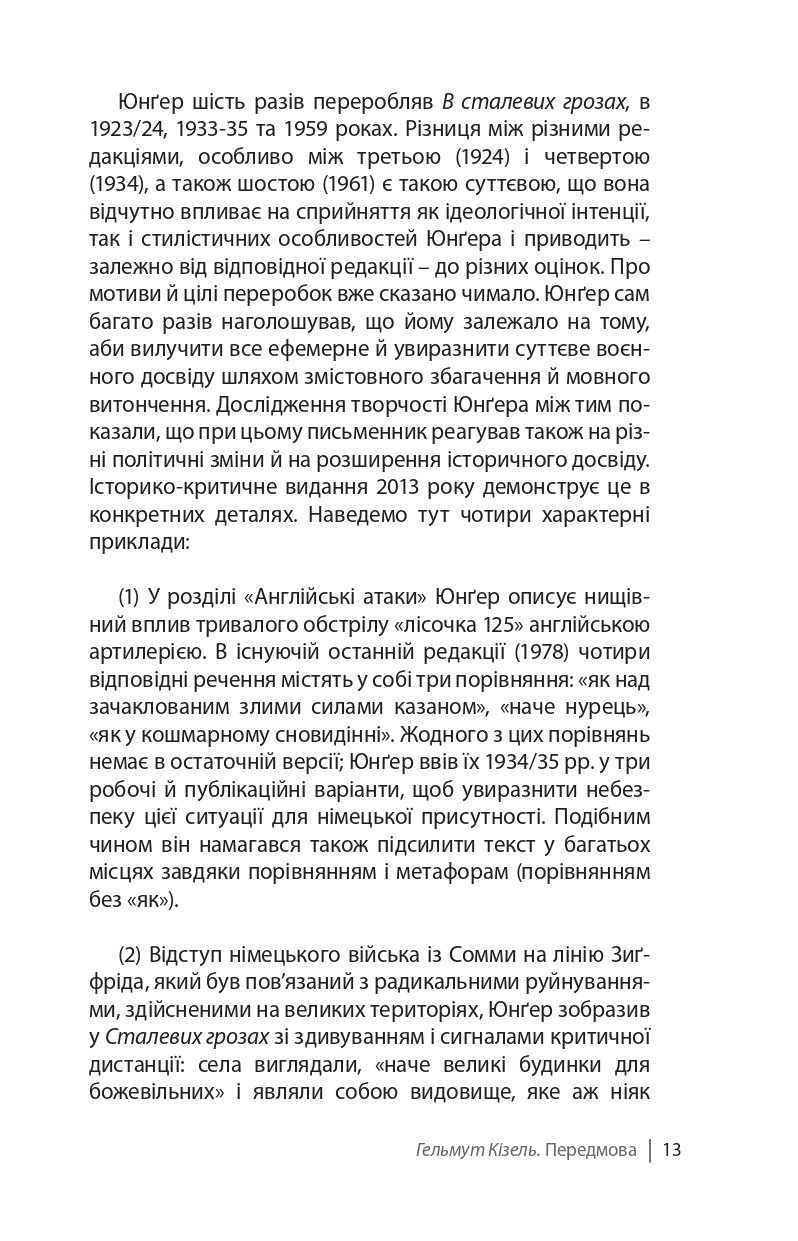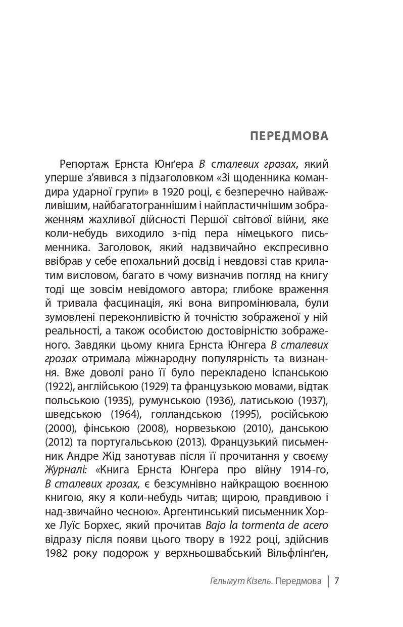 Найвідоміша книга Ернста Юнґера "В сталевих грозах", яка має підзаголовок "Зі щоденника командира ударної групи", була вперше опублікована 1920 р. коштом автора й упродовж кількох років стала бестселером. Це, можливо, найдокладніша, найправдивіша, найважливіша книга про Першу світову війну. Форма щоденника виявилася при цьому адекватним засобом передачі фронтових вражень: регулярні й точні, хоча й фрагментарні нотатки утворюють врешті-решт багатоманітну й вражаючу воєнну мозаїку, яка не могла б бути переконливішою.
