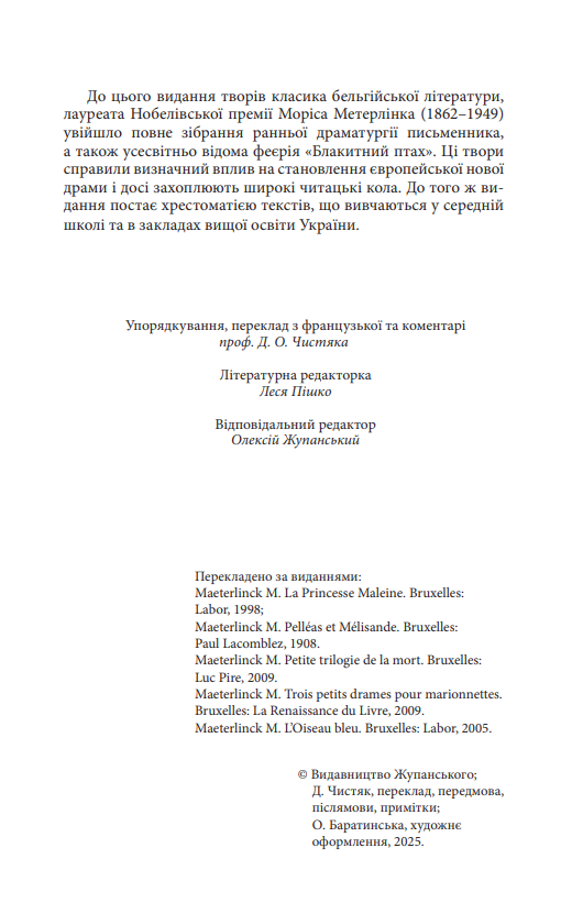 До цього видання творів класика бельгійської літератури, лауреата Нобелівської премії Моріса Метерлінка (1862–1949) увійшло повне зібрання ранньої драматургії письменника, а також усесвітньо відома феєрія «Блакитний птах». Ці твори справили визначний вплив на становлення європейської нової драми і досі захоплюють широкі читацькі кола. До того ж видання постає хрестоматією текстів, що вивчаються у середній школі та в закладах вищої освіти України.