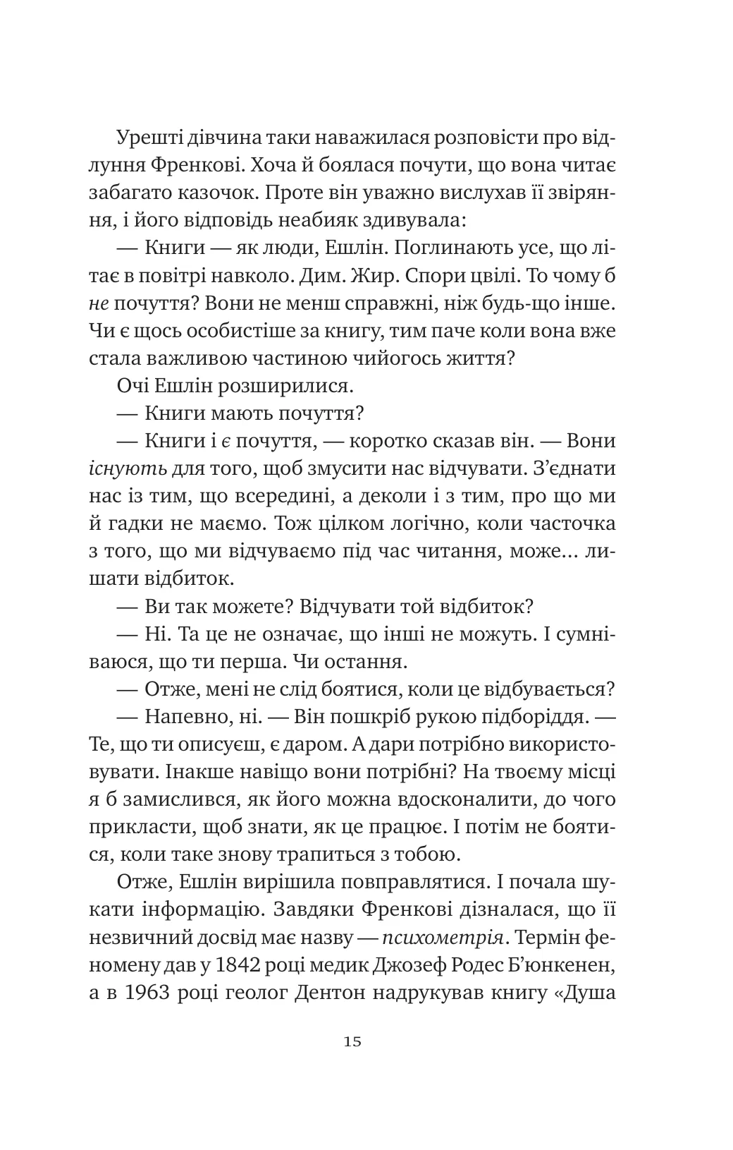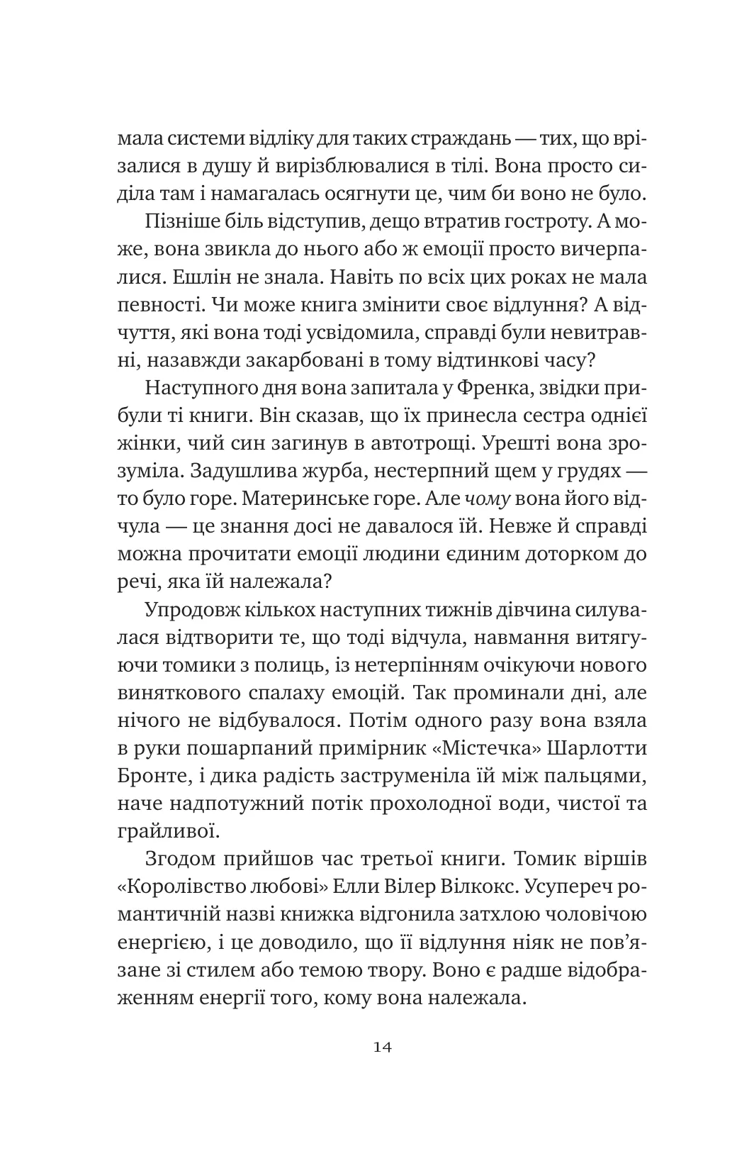 Торговиця рідкісними виданнями Ешлін Ґрір має незвичайний дар: її любов до книжок виходить далеко за межі запаху старого паперу, чорнила й шкіри. Ешлін відчуває відлуння емоцій їхніх попередніх власників — слід, який може прочитати тільки вона.