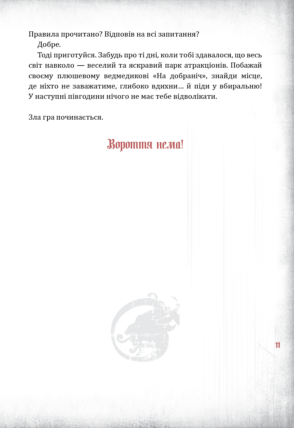 На жаль, сталася страшна помилка. Ця книжка ніколи не мала бути надрукована. Зараз видавництво вивчає всі обставини того, як таке сталося. У книжці містяться магічні формули та слова, яких ніхто не має чути! Тут наведено лише зухвалу брехню й загадки, які спантеличують навіть дорослих. А на початку ще й копошаться монстри!
