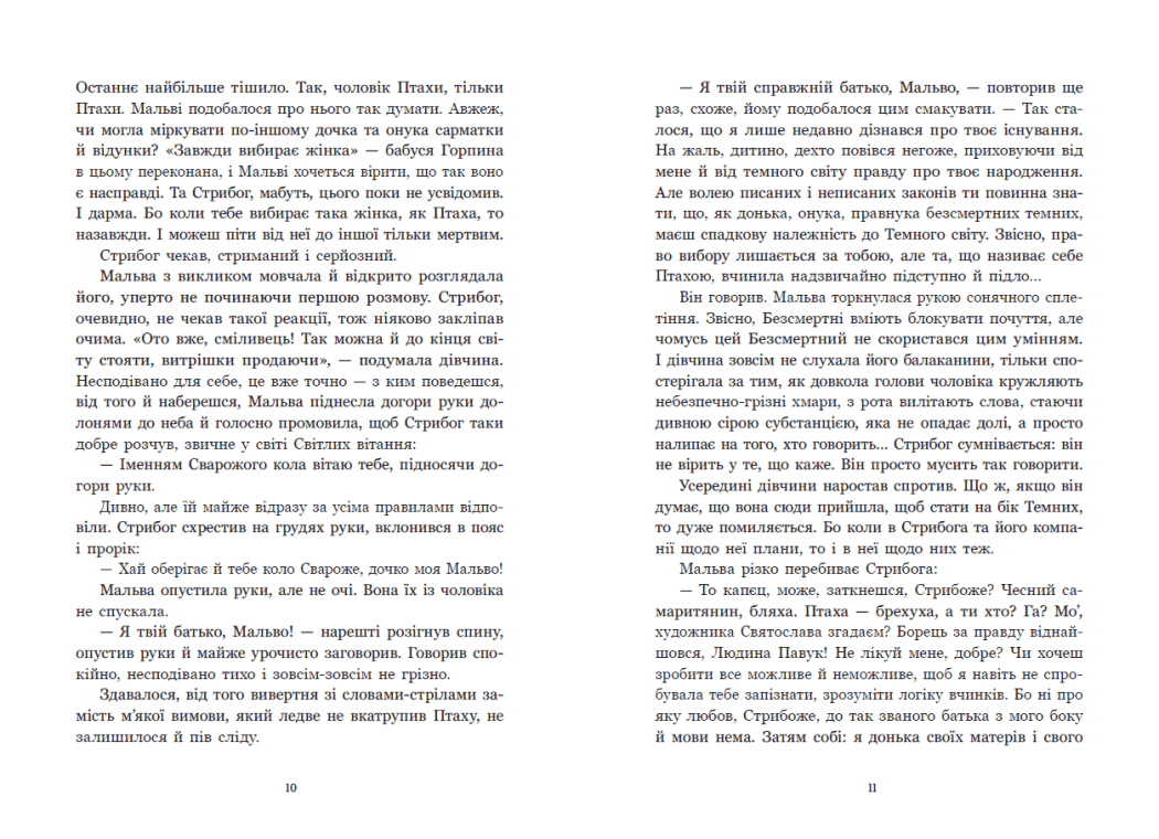 ...а поки Мальва мандрує світами. От і до темних завітала, до батька Стрибога. І Птаха не заперечувала, відпустила. А що? Мальва не боїться якихось-то дітей Чорнобогових. Вона зухвала, гостра на язик, темні їй не указ. Чи указ? І Мальва не боїться, бо геть не уявляє могутності темних? Їхньої жорсткої сили. І їхньої впевненості, що вона — вже їхня, що темна, просто не усвідомила це. І що ж робити? Як їй бути? Ким їй бути?