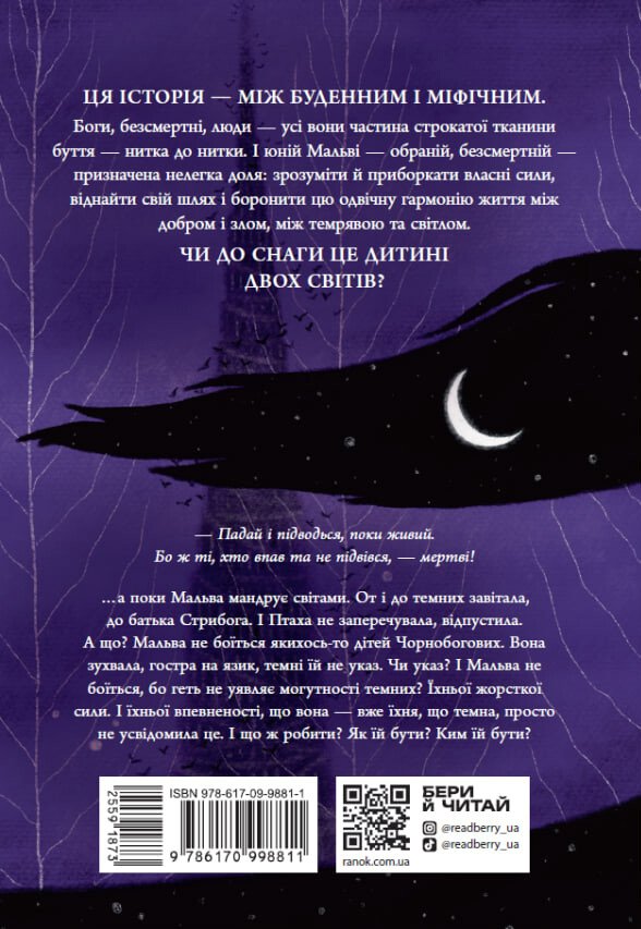 Боги, безсмертні, люди — усі вони частина строкатої тканини буття — нитка до нитки. І юній Мальві — обраній, безсмертній — призначена нелегка доля: зрозуміти й приборкати власні сили, віднайти свій шлях і боронити цю одвічну гармонію життя між добром і злом, між темрявою та світлом.